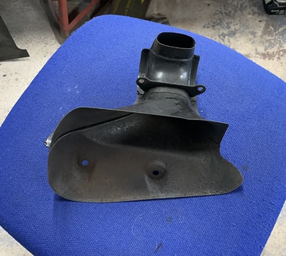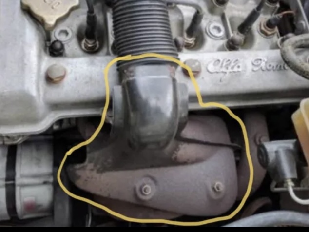 Here we have an original hot air collection shroud as fitted to Alfetta, Giulietta These are Fitted to the exhaust manifold and linked to the Airbox with a pipe across the cam cover (see picture). These are hard to find now as they usually totally rust away. Or at least rust around the mounting holes on the manifold Leading to an annoying rattle