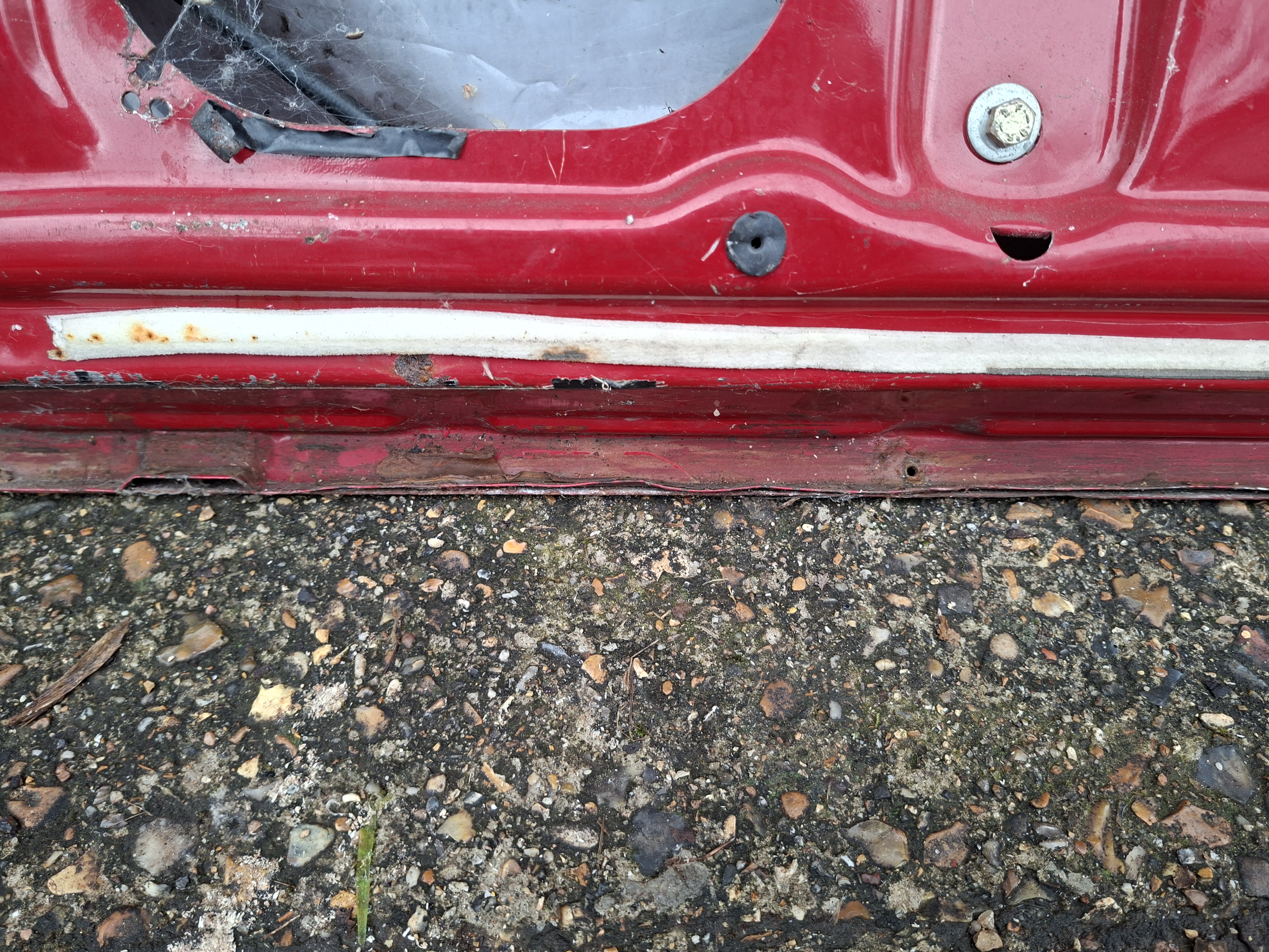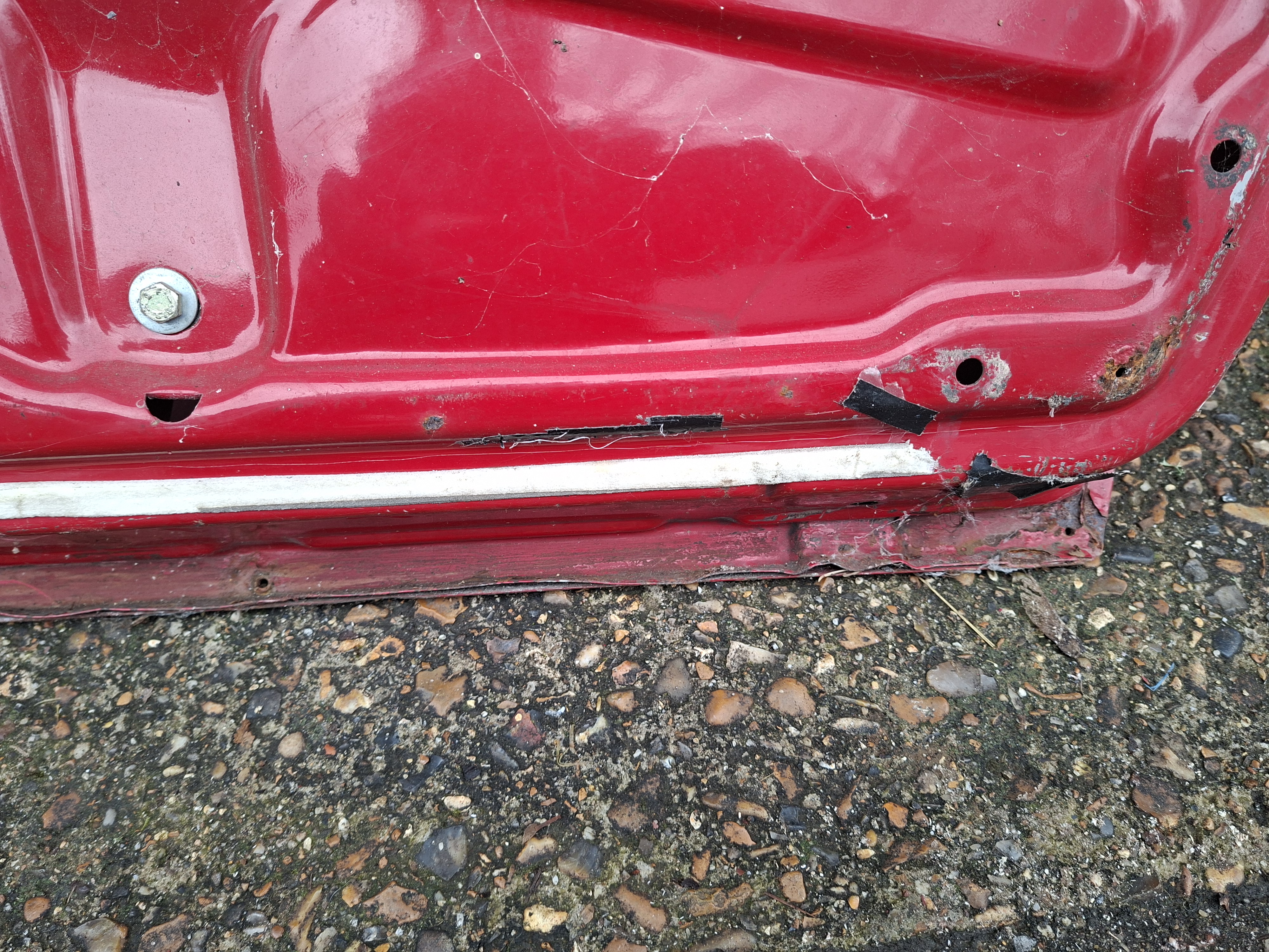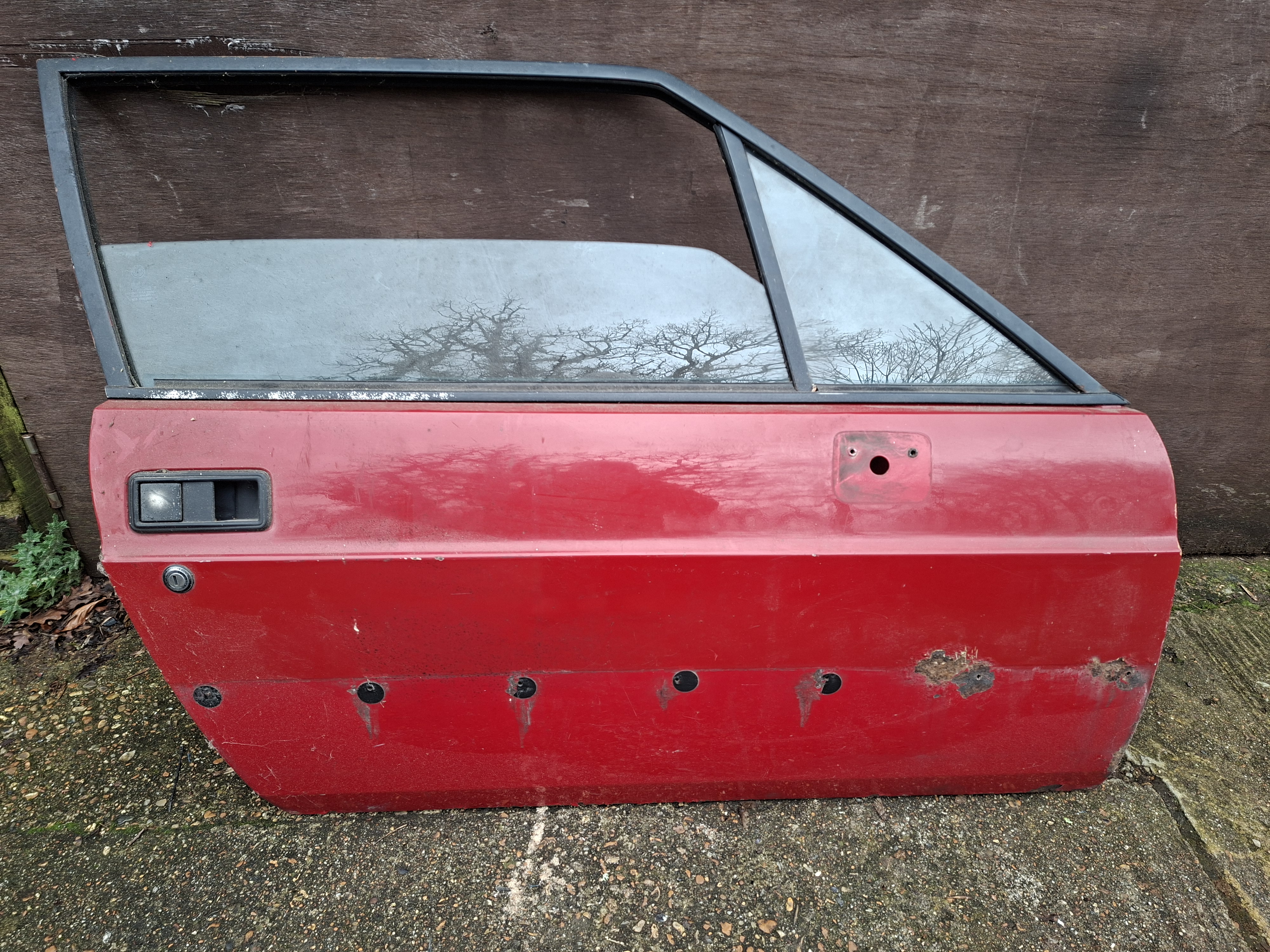 Offside door for 1983 or later Sud Sprint. No base rot, see pictures. Surface rust around some trim fastener holes. No hinges, no door latch, no lock button, no mirror, internal handle broken (?) BUT the hard to get end caps for the window trim strip are present! Pics of bottom outer skin on request.