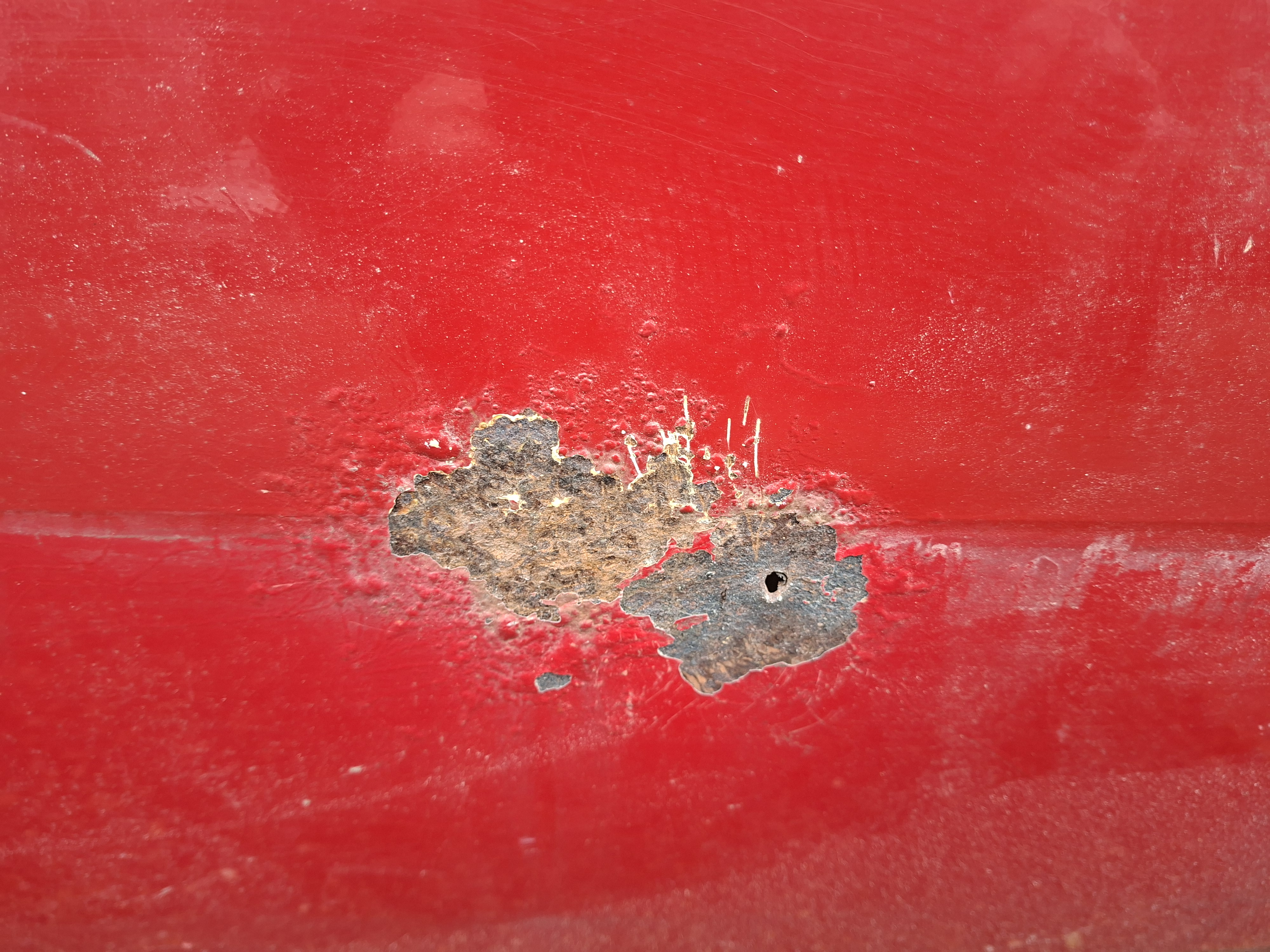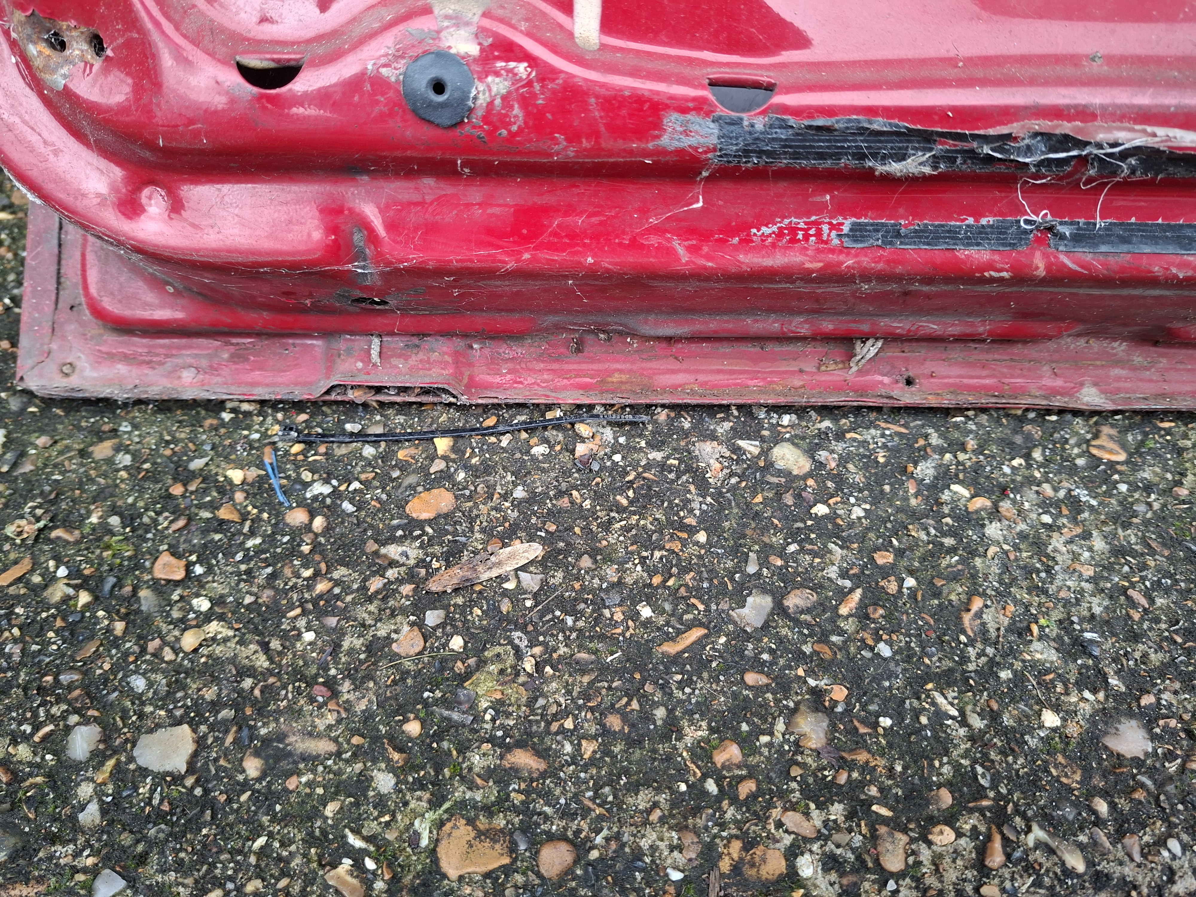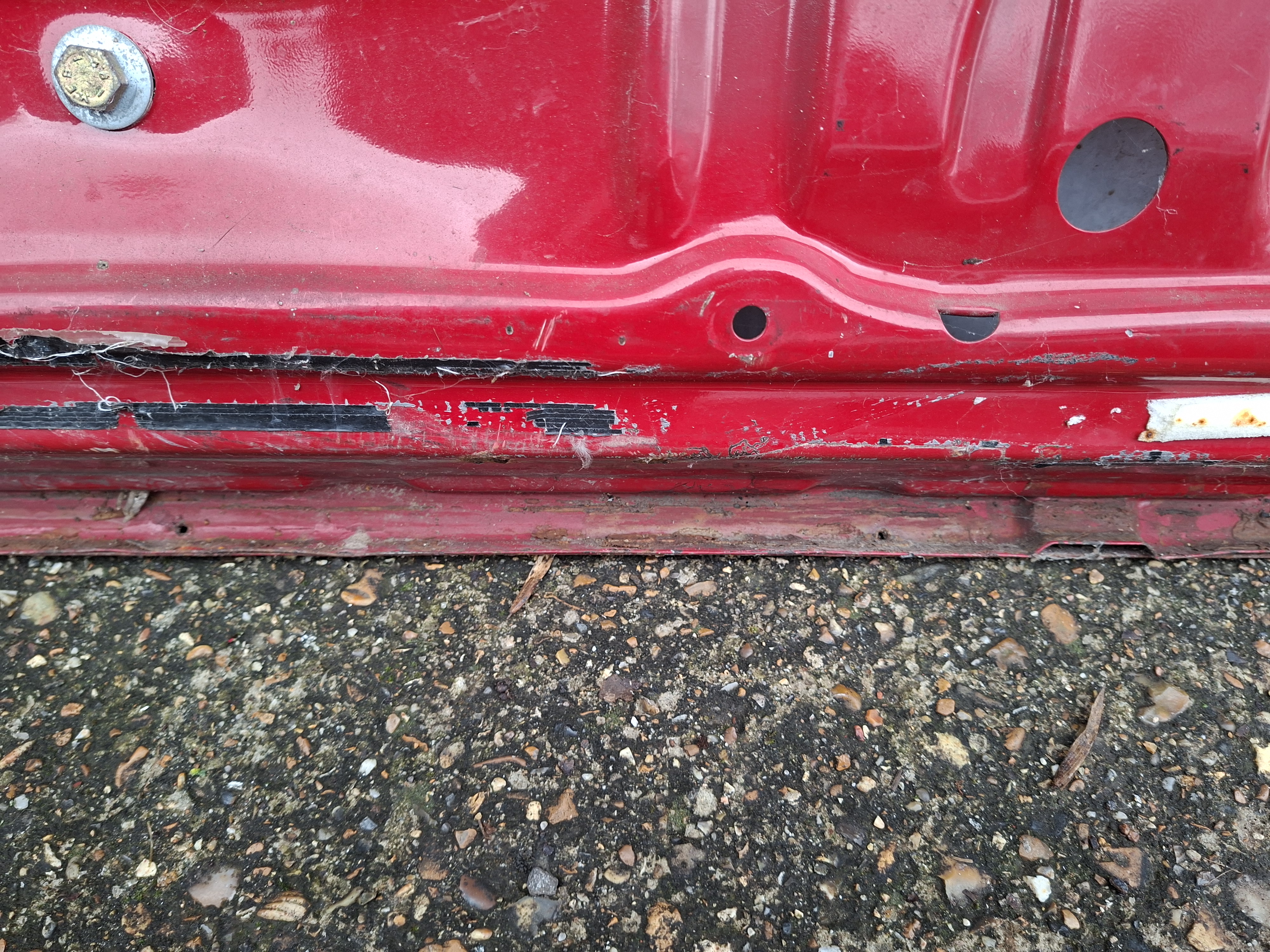 Offside door for 1983 or later Sud Sprint. No base rot, see pictures. Surface rust around some trim fastener holes. No hinges, no door latch, no lock button, no mirror, internal handle broken (?) BUT the hard to get end caps for the window trim strip are present! Pics of bottom outer skin on request.