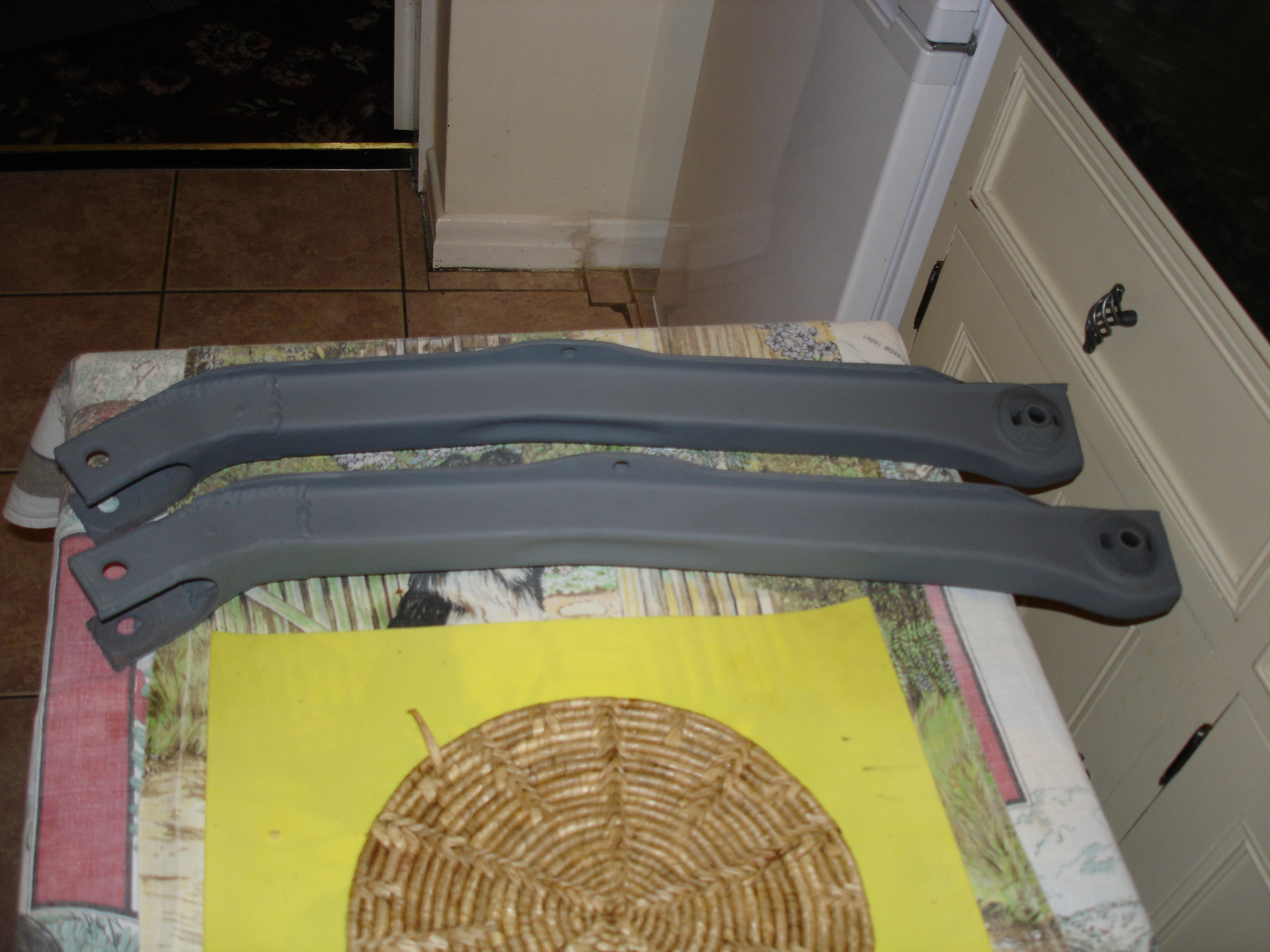 I too purchased replacement arms which luckily seem to be exactly the same length as the originals, but have come across another problem as they utilise a different type of bush at the front end. The Super bush (and the ones I can see in the photos of your car) both have two small oval shaped holes in them to increase compliance. The replacement arms I got hold of use a harder solid bush which I think may be for the late model Green Cloverleaf Ti and Sprint which were initially fitted with those odd size Michelin low profile tyres. I am not sure how these arms/bushes will affect the handling and noise transmission characteristics if fitted to the Super, so am somewhat wary of using them. At the moment the plan is to re make and re weld new thicker reinforcing plates onto the front of the original Super arms, much as you have as the arms both look otherwise sound having been media blasted clean.