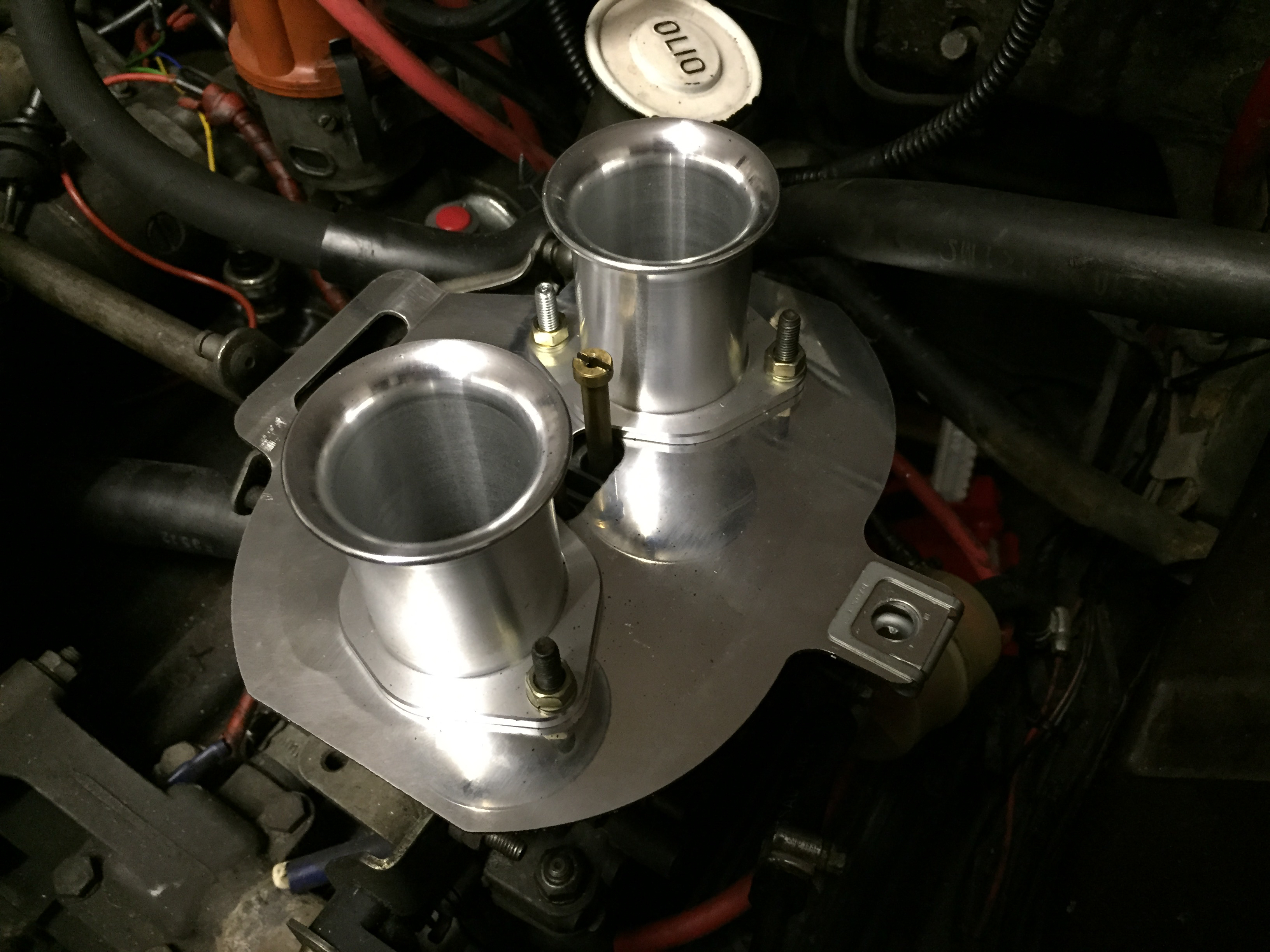 The light units on the car were S2 backplates with S3 plastic trim and Capri lamp units. They fitted so badly that the car looked quite sad. I got two complete new LHD S3 light front light clusters from a fine gentleman on this website and a new grille from Italy and the car is starting to look much better. It should breathe better now. The exhaust gaskets were not cut to fit the larger exhaust ports and the intake trumpets were fitted with one stud and were offset and impeding flow. The carbs were stripped and an overhaul kit fitted as well as drilling and tapping for a new stud for each trumpet. New trumpets (shiny!) and new piper intake filters.