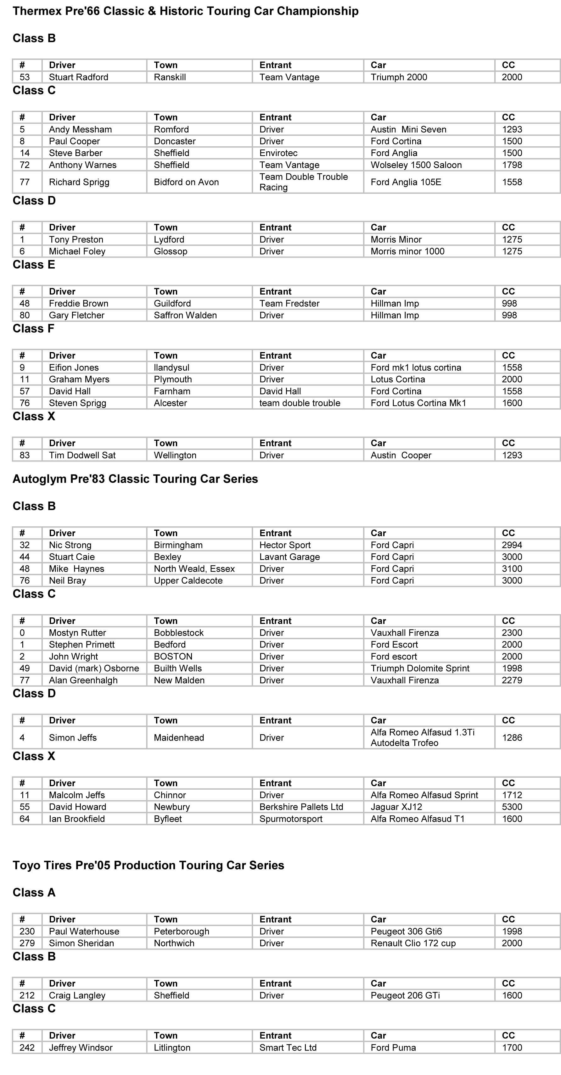 Does anybody know where you would find the entry list for Castle Combe???? it would be quite nice to know who has entered,whats in your Class, how many Fords will you have to try & not run into going into a corner :) Can't workout which Championships are racing with us either,BARC say pre-66 pre-83 & pre-05 but I also got an email from CTCRC saying pre-66 & pre 83 42 car grid!